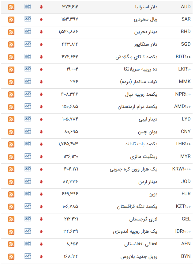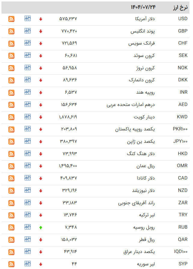 دلار آمریکا | USD | ۷۱۸,۴۹۰ | ۷۲۵,۰۱۵ | -۲۸۷ | ۶۹۷,۵۶۳ | ۷۰۳,۸۹۸ | -۲۷۹ |