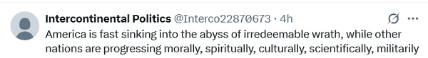 در حالی که سایر ملتها از نظر اخلاقی، معنوی، فرهنگی، علمی، نظامی و غیره در حال پیشرفت هستند،آمریکا به سرعت در ورطه خشم جبرانناپذیری فرو میرود.