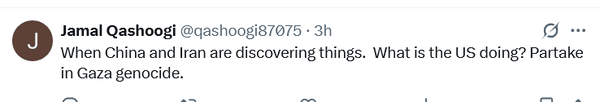 در حالی که چین و ایران در حال کشف چیزهایی هستند. ایالات متحده چه میکند؟ در نسلکشی غزه شرکت می کند.