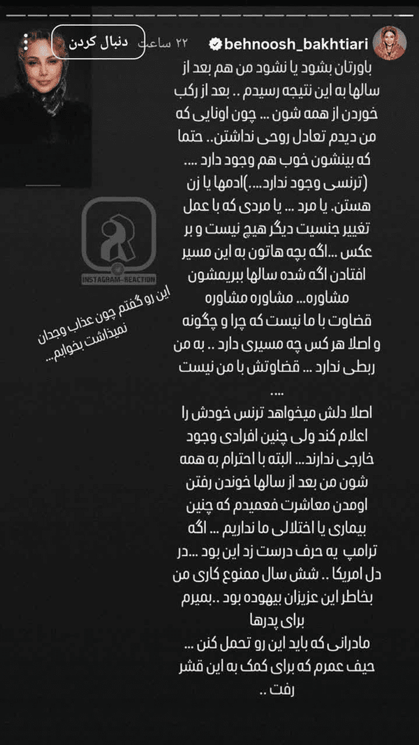 خبر را برای من بخوان در روزهای گذشته، بهنوش بختیاری بازیگر شناختهشده سینما و تلویزیون در صفحه شخصی خود اظهار نظری منتشر کرد که بازتاب گستردهای داشت. او در استوری خود نوشت که سالها بر مسیری پافشاری کرده که امروز آن را غلط میداند؛ مسیری که به موضوع «ترنس بودن» مربوط بود. وی ادعا کرد