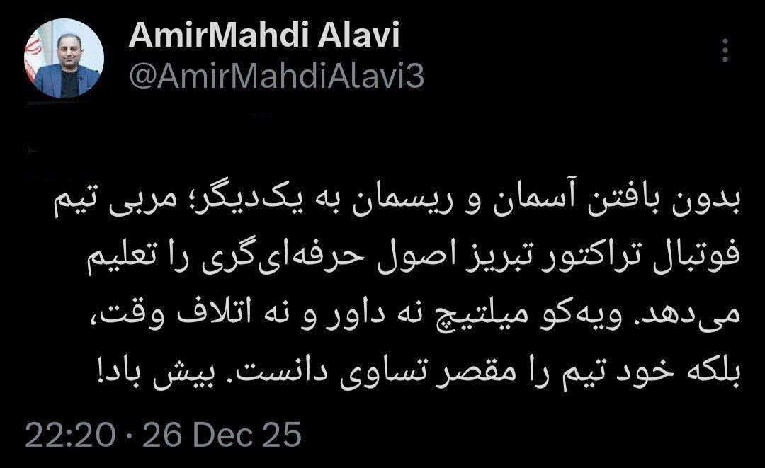 باشگاه خبرنگاران جوان – امیر علوی سخنگو و مدیر روابط عمومی فدراسیون فوتبال پس از حاشیههای شب گذشته توسط مالک تراکتور در فضای مجازی پستی را منتشر کرد.