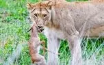 بچه ایمپالا در حالی که سرش را داخل دهان شیر گذاشته بود، به مبارزه ادامه داد.
