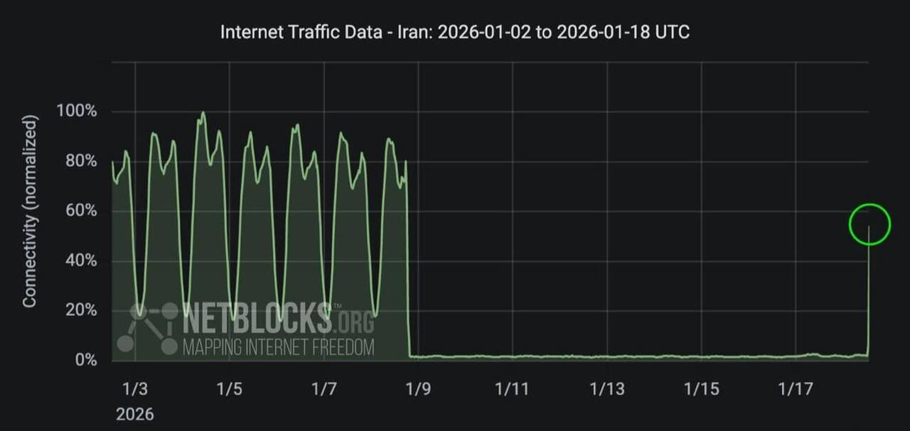 به گزارش خبرگزاری خبرآنلاین، طبق دادههای ترافیک اینترنت در بازه زمانی ۲ تا ۱۸ ژانویه ۲۰۲۶، سطح اتصال که در روزهای گذشته به رقم بحرانی ۲ درصد سقوط کرده بود، اکنون با یک جهش عمودی به سطح ۵۴ درصد رسیده است. این تغییر ناگهانی نشاندهنده آغاز فرآیند رفع محدودیتها از سوی اپراتورها و زیرساخت ارتباطی کشور است.