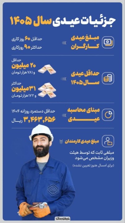 جزئیات عیدی کارگران و کارمندان در سال 1405 منتشر شد.مبلغ عیدی کارگران در سال 1405 بر اساس قانون کار بین دو تا سه برابر پایه حقوق تعیین میشود. بنابراین، حداقل عیدی برابر با دو ماه حقوق و حداکثر عیدی برابر با سه ماه حقوق پایه خواهد بود. رقم دقیق آن پس از اعلام شورای عالی کار مشخص میشود.