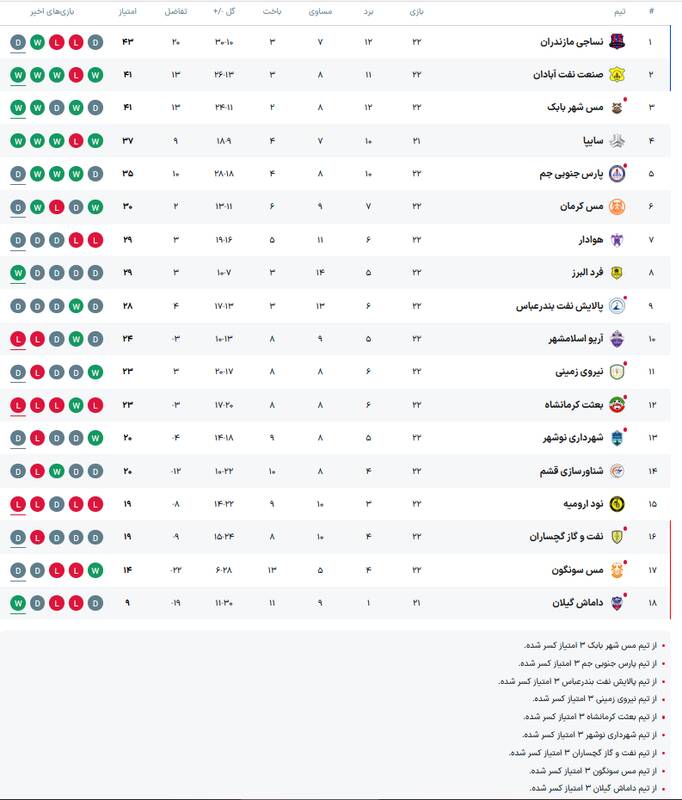 نساجی مازندران در این هفته با هدایت رضا عنایتی، سرمربی جدید خود به مسابقات آمد و با این نتیجه در صدر جدول ۴۳ امتیازی شد. صنعت نفت آبادان و مس شهر بابک با کسب پیروزی در این هفته با ۴۱ امتیاز در تعقیب صدرنشین هستند.